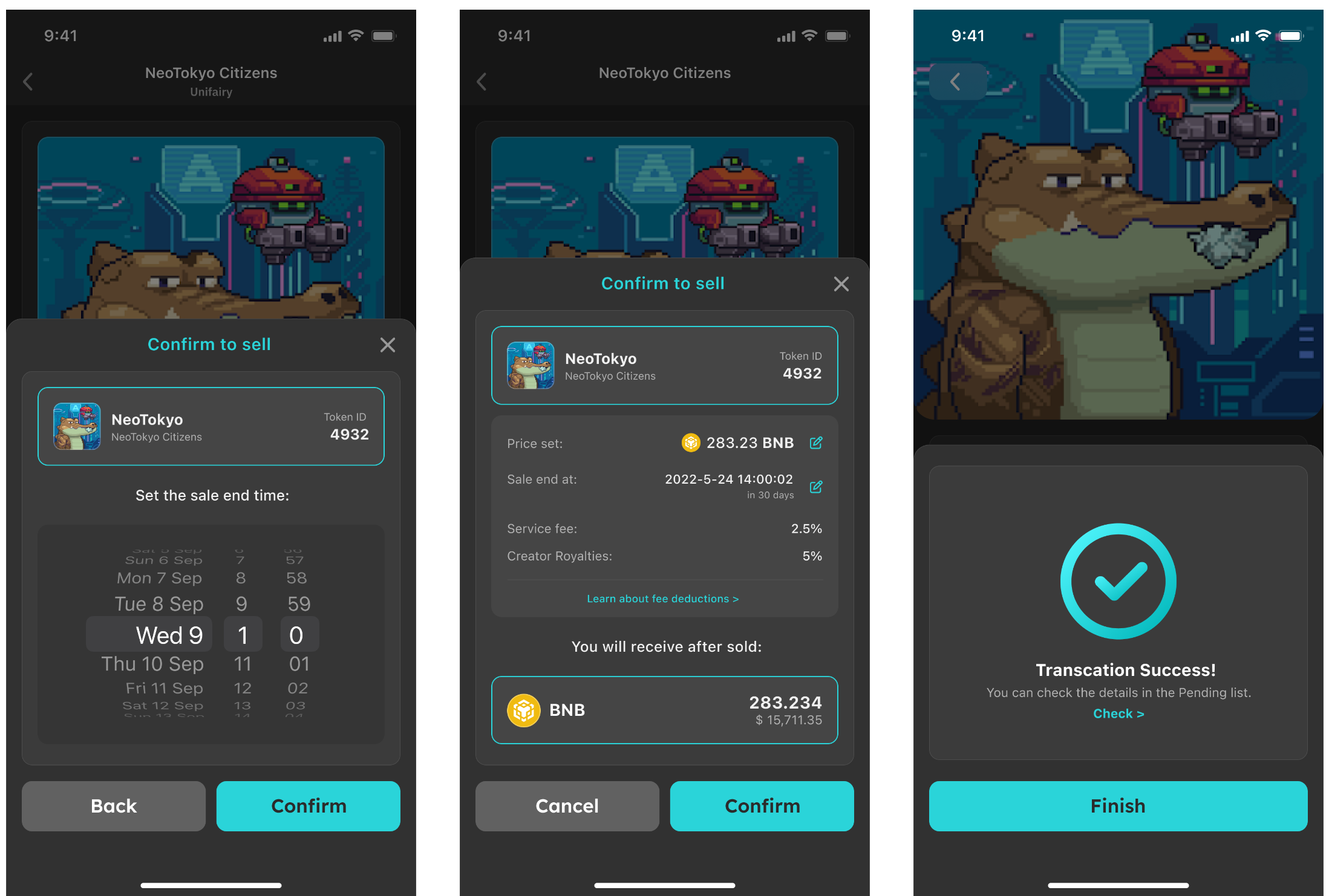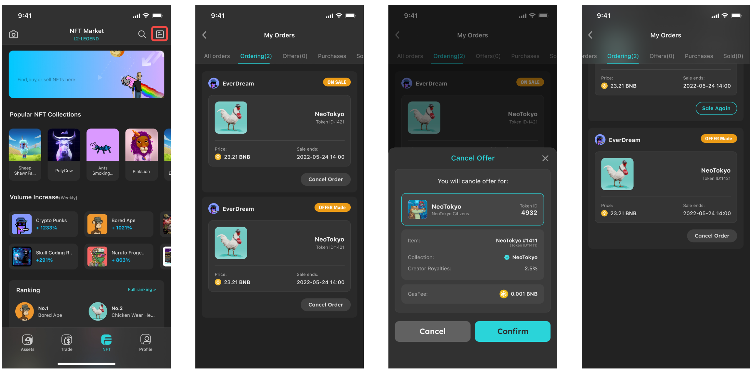 Step 2: Confirm to cancel the offer. Gas fees are paid in BNB and are fixed at 0.1% on Legend. You can enter My Orders to view it and choose to Sell Again with a different price and time limit.