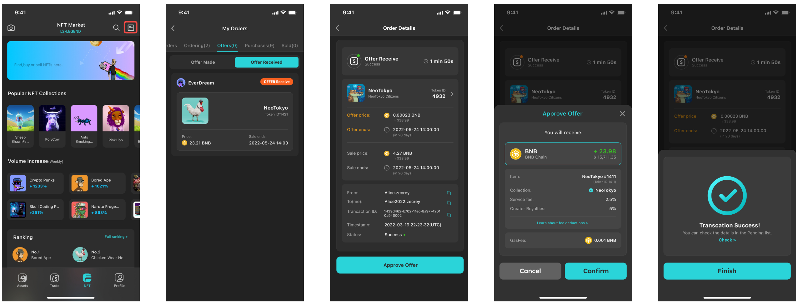 Step 2: Click on Approve Offer and check the details. Gas fees are paid in BNB and are fixed at 0.1% on Legend.