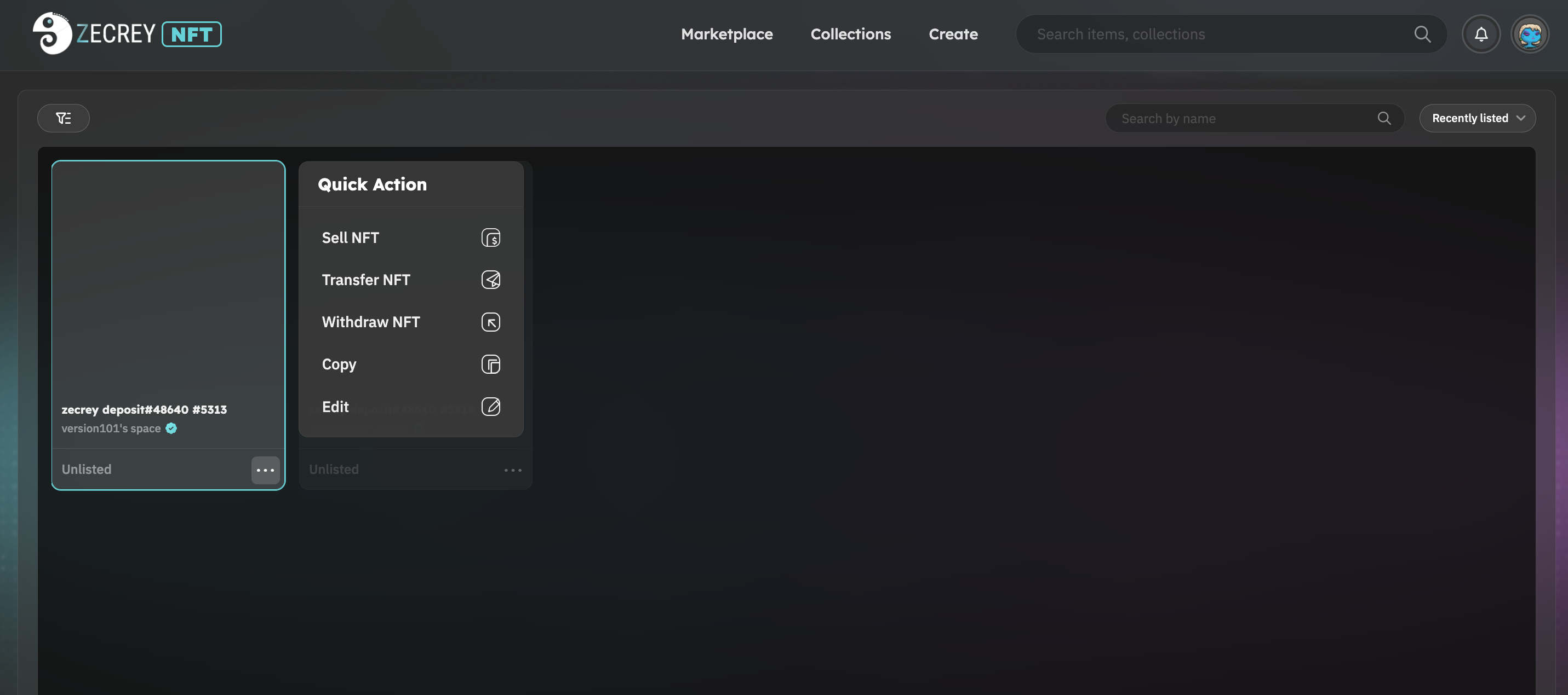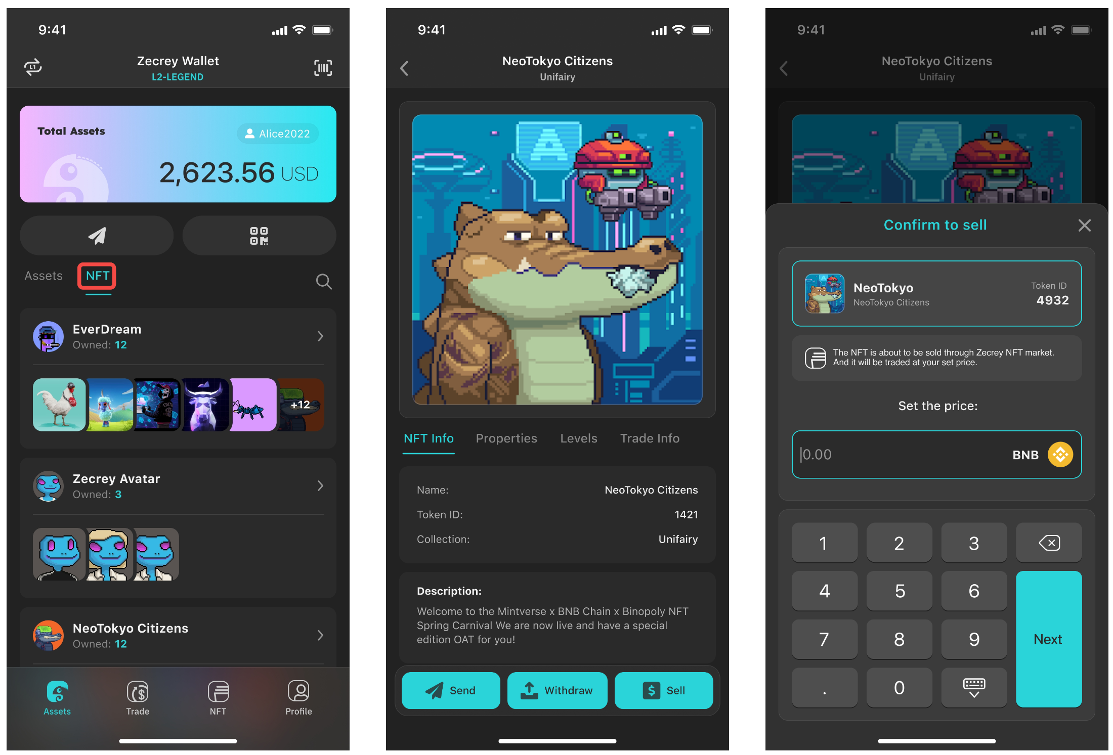 Step 1: Switch to Zecrey L2-Legend wallet and click on "NFT" beside the Assets on the homepage to view your NFT assets sorted by collections. Select the NFT you want and click "Sell".