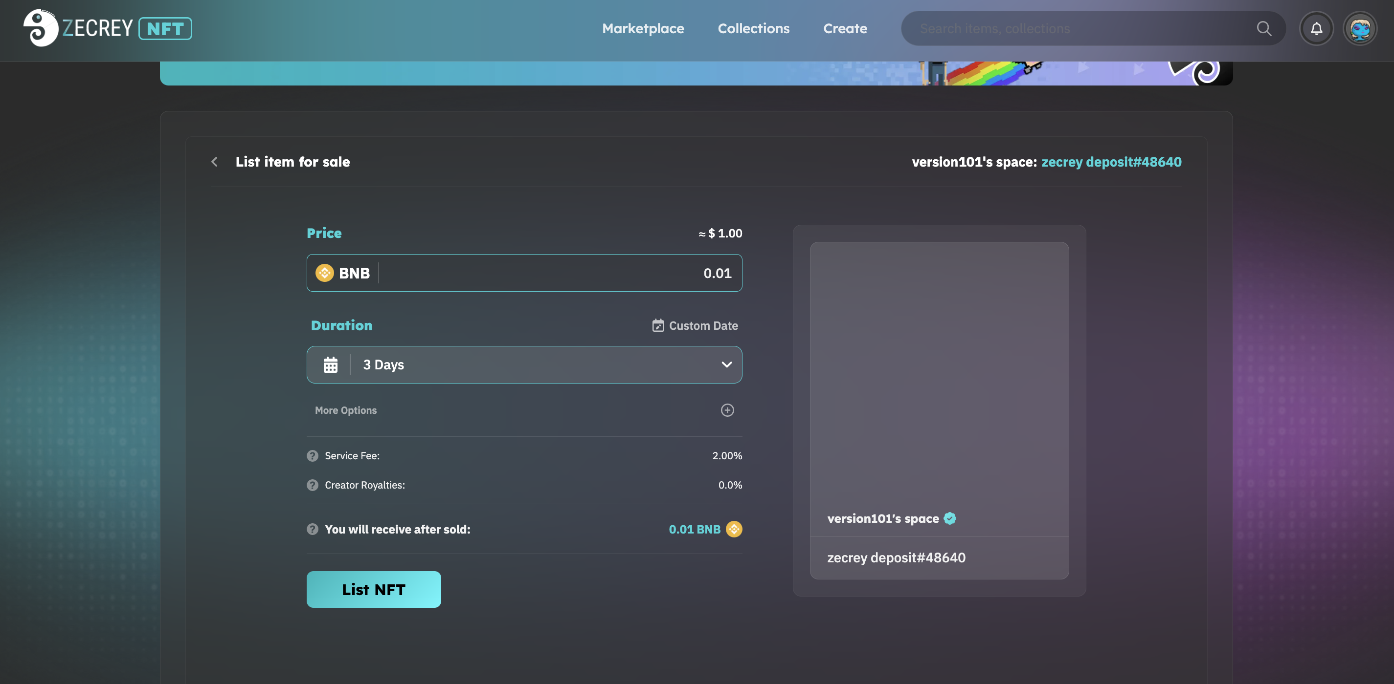 Step 4: Fill out the price and set up duration and then click List NFT button to confirm the sell. You'll need to sign the transaction with Zecrey extension wallet.